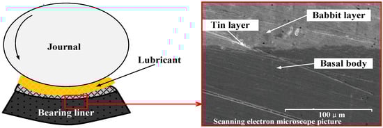 The working surface of a sliding bearing must exhibit favorable running-in properties and embeddability []. To optimize the performance of bearing alloy materials while minimizing costs, sliding bearings are typically designed as multi-layer structures []. These structures feature a steel-bearing bush coated with a transition layer, followed by a layer of cast-bearing alloy material, as illustrated in Figure 1 []. Tin is the most commonly used transition layer, while ZSnSb11Cu6 is the standard-bearing alloy material [].