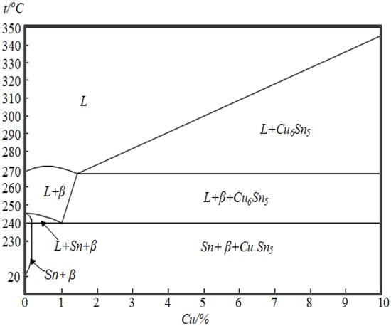Ternary phase diagram of the Sn-Sb-Cu system for Babbitt alloy ZChSnSb11-6. Reproduced with permission from [].
