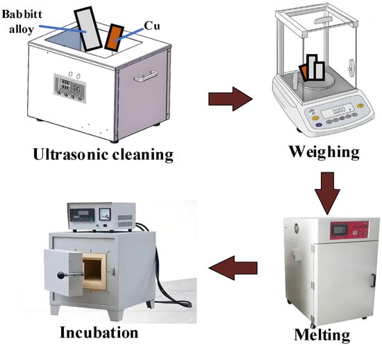 First, the round steel tube was cleaned and dried in an oven to eliminate residual moisture and prevent the splashing of molten metal during casting. The tube was then preheated to 300 °C to maintain the fluidity of the molten alloy during casting, ensuring proper filling. The prepared modified Babbitt alloy melt was poured into a preheated steel tube and gently stirred with a metal rod. When the liquid metal began to solidify, it was rapidly cooled with water. When the temperature dropped to 200 °C, the material was placed in a holding furnace for 1 h and then cooled within the furnace to form a rod-like structure. After casting, the Babbitt alloy bar did not require demolding and was processed directly. Figure 3 illustrates the experimental equipment and process flow for incorporating copper into the Babbitt alloy.