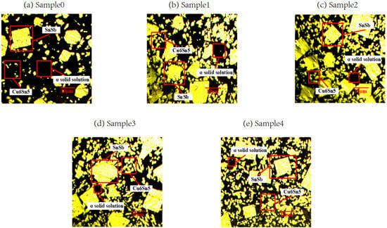 Metallographic observations and analyses were conducted using a research-grade inverted metallographic microscope (PMG3). The microscope offered a maximum optical magnification of 2000× and a digital display magnification of 1000×. Metallographic structure analysis was performed in the following steps: sample polishing, sample etching, metallographic structure observation, and metallographic structure analysis. For etching, a cotton swab dipped in 2% nitric acid alcohol was used to gently wipe the sample surface for approximately 30 s. Subsequently, the sample was rinsed with distilled water and dried. Figure 4 illustrates the microstructure of the Sn-based Babbitt alloy before and after modification with copper powder. In the micrographs, the dark matrix represents the α solid solution of tin, the larger white triangles or squares correspond to the β phase (SnSb), and the white needles, dots, or short rods indicate the ε phase (Cu6Sn5). The micrographs revealed that as the amount of copper powder increased, the black matrix (α solid solution of tin) decreased, while the ε phase (Cu6Sn5) increased. The β phase exhibited minimal change in quantity but showed a decrease in grain size.