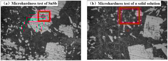 In Equation (1), P is the load (g), and d is the diagonal length of the notch (μm). The measurement software interface is shown in Figure 5, and the measurement results are listed in Table 2. It can be seen from the measurement results that the Microhardness test of SnSb increases with the increase of copper content. With an increase in copper content, the microhardness of the α solid solution decreased slightly.