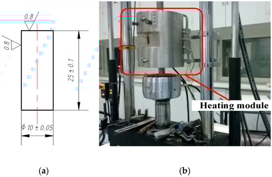 The design of the compression specimens adhered to the standard GB/T 7314-2005, Metallic Materials Compression Test Method at Room Temperature []. The dimensions are illustrated in Figure 5a. High-temperature compression tests were conducted using an Instron 5500 R (Norwood, MA, USA) electronic tensile-compression testing machine equipped with a heating module, as shown in Figure 5b. The tests were performed at 120 °C. Each sample was preheated to the designated temperature and maintained at this temperature in the heating and holding furnace of the testing machine for 15 min before initiating the compression testing.