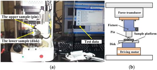 The steps for conducting each friction and wear test are as follows. First, the pins and plates to be tested were placed in an acetone solution, cleaned using an ultrasonic cleaner, and weighed using a precision electronic balance after drying. Next, the disc was mounted on the rotating table of the UMT-2 friction and wear testing machine, and the pin was secured in the fixture. The operation interface of the UMT-2 testing machine was accessed to input the test parameters, such as the test force F, rotational speed n, rotational radius r2, and test time t. After zeroing the system, the start button on the interface was pressed to initiate the test. During the test, data were collected using the sensors, and the system software calculated the friction coefficient. After the test, the pins and plates were removed and cleaned using an ultrasonic cleaner. Their mass was measured using a precision electronic balance to determine the amount of wear. The friction coefficient and other data were then exported. For tests requiring oil or water lubrication, the lubricating medium was applied to the surface of the lower sample plate immediately after the disc was mounted on the rotating table of the UMT-2 testing machine. Additional lubricant can be added during the test if necessary.
