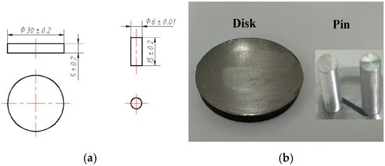 (a) Schematic presentation showing the dimensions of the friction and wear test specimens and (b) their physical appearance.
