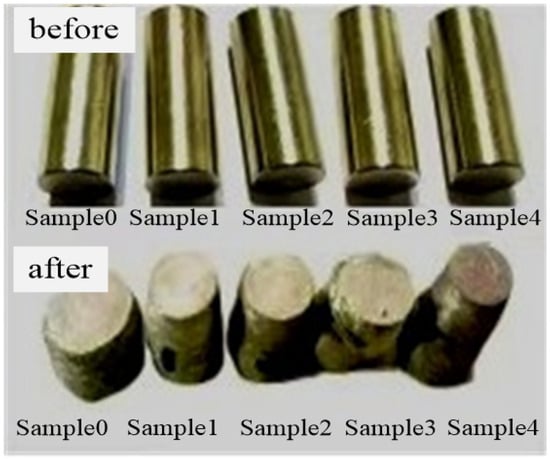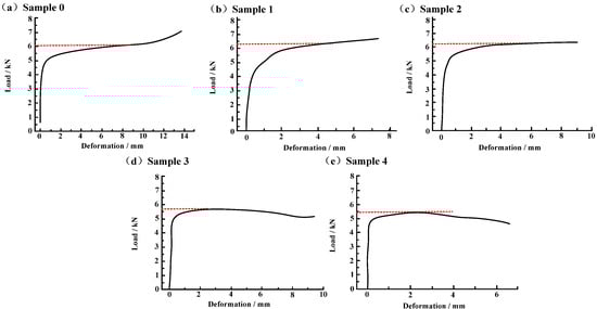 Figure 8 illustrates the samples before and after the compression testing. Samples 0, 1, and 2 were finally deformed into a drum shape. For sample 0, the load-deformation curve remained relatively flat with an insignificant upward trend, resulting in a longer test duration and larger compression deformation. The sample did not fracture when the compression deformation reached 13 mm. Samples 1 and 2, on the other hand, completed the test once the compression stabilized. The compression deformation for these samples was approximately 9 mm, and no fractures were observed. In contrast, samples 3 and 4 exhibited a noticeable decrease in compressive load when the deformation reached 3–4 mm. Post-test observations revealed clear signs of failure in Samples 3 and 4, with fractures occurring along oblique sections forming an angle of 45–55° relative to the normal line and sample axis.