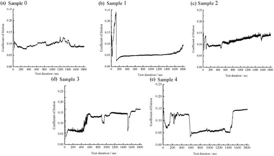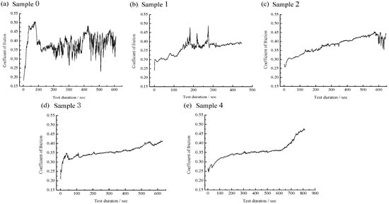 Friction coefficients of Babbitt alloys with different copper additions under 25# oil lubrication conditions. (a) Friction coefficients curves of the sample sample without Cu addition; (b) Friction coefficients curves of the sample with 1 % Cu addition; (c) Friction coefficients curves of the sample with 2 % Cu addition; (d) Friction coefficients curves of the sample with 3 % Cu addition; (e) Friction coefficients curves of the sample with 4 % Cu addition.