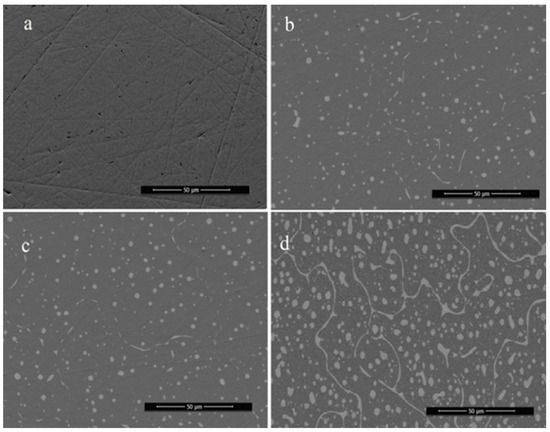 SEM images Ni50Ti30Hf20−xLax (x = 0, 0.5, 1, 2 at%). (a) Ni50Ti30Hf20; (b) Ni50Ti30Hf19.5La0.5; (c) Ni50Ti30Hf19La1; (d) Ni50Ti30Hf18La2.