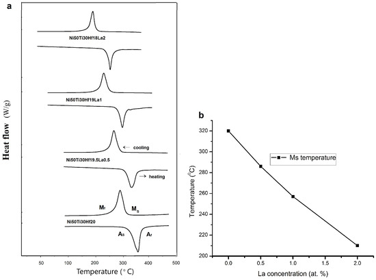 Figure 2a shows the DSC results for the Ni50Ti30Hf20-xLax (x = 0, 0.5, 1, 2) alloy. As the measurement results show, there was one peak in the process when all the alloy samples were heated and cooled, indicating that the temperature-dependent crystal structure transition is a one-step B2↔B19’ or direct transition. The nature of this phase transformation corresponds to the phase transitions of Ni-Ti-Hf-Y [10], Ni-Ti-Hf-Nd [11], and Ni-Ti-Hf-Ta [12] alloys. The martensitic phase transformation start temperature (Ms), the martensitic phase transformation finishing temperature (Mf), the austenite phase transformation start temperature (As), and the austenite phase transformation finishing temperature (Af) determined from the differential scanning calorimeter (DSC) curves and the results of some articles are shown in Table 2.