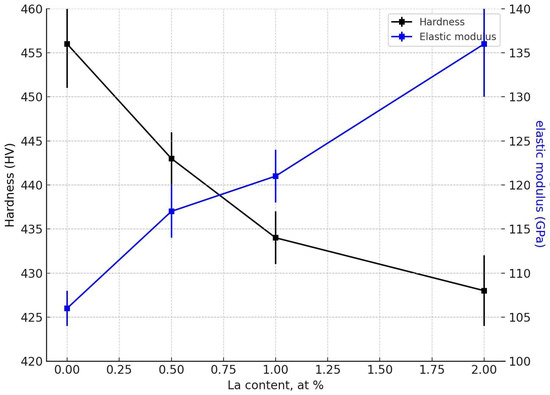 Although lanthanum is a hard rare-earth metal, its addition caused a decrease in hardness, likely due to its influence on the microstructure and second phase distribution. The addition of La could have promoted the formation of softer eutectic structures or La-rich intermetallic phases that do not contribute effectively to hardening. La might also alter the solidification path and grain structure, potentially leading to coarser microstructures or a decrease in the quantity of hard secondary phases. These microstructural changes may offset any potential hardening effects associated with La as an individual element.