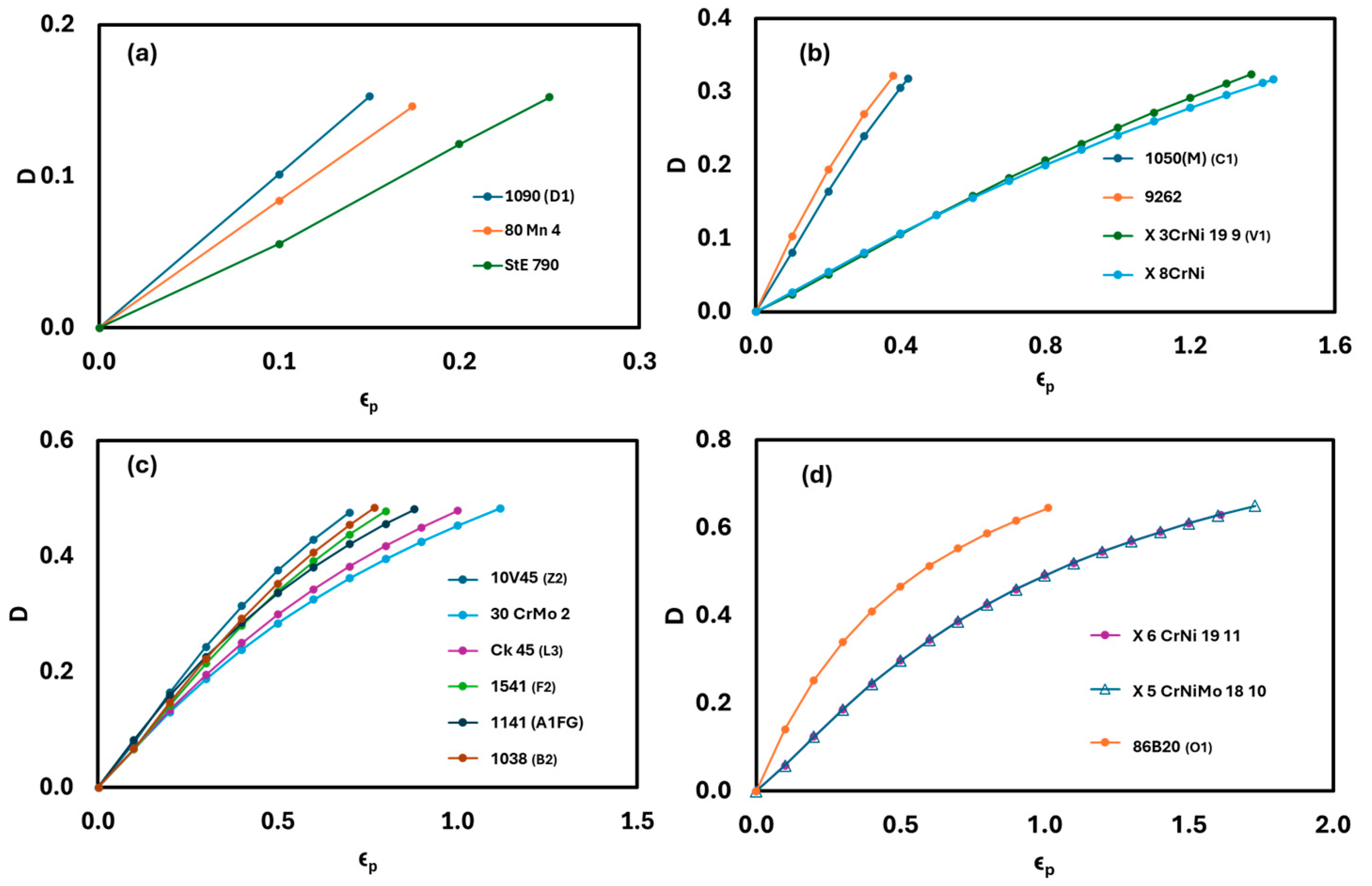 - The critical damage values of steel alloys vary over a wide range of 0.1–0.7, and this study can be used to quickly determine the specific material when the damage criterion is crack initiation.