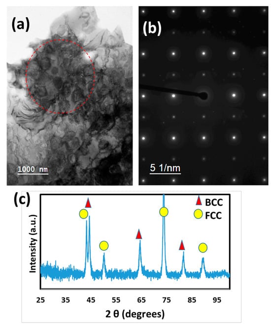Fe35Mn21Ni20Cr12Al12 HEA was manufactured from pure elements using an arc melting furnace in an inert atmosphere and then cold rolled to a reduced thickness of 90% []. The cold rolled sheet was cut into 5 × 5 × 0.5 mm3 samples using a wire cutter. The basic roles of Al and Cr in this HEA are to stabilize the BCC phase, increase strength, decrease the oxidation rate, and increase the stability of the oxides more than the other present elements; Fe, Ni, and Mn [,]. The samples were ground from all surfaces with emery papers from 220 to 1000 grit, then polished with alumina paste 0.3 µm then cleaned with alcohol before oxidation. The phases formed were studied by X-ray diffractometer with the model (PRO PAN analytical diffractometer, X’Pert, Almelo, Netherlands) and the Cu Kα radiation source λ = 0.15406 nm, 45 V, and 40 mA with angles from 30 to 100. Transmission electron microscopy (TEM, JEM-ARM1300S, JEOL, Akishima, Japan) was used to characterize the phases of the alloy.