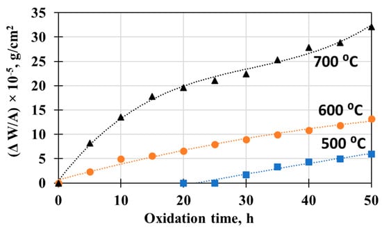 The weight change of the present HEA samples was recorded during the oxidation process, and then the weight gain was calculated. Here we consider only the oxidation process, so, dry air is considered to avoid complications if oxidation happens in humidified air []. Figure 2 illustrates the mass change/surface areas of tested samples during isothermal oxidation in dry air for 50 h at 500 °C, 600 °C, and 700 °C. Figure 2 shows the relation between the weight change vs. time which follows a linear relation, not parabolic. The oxidation kinetics of cold-rolled Fe35Mn21Ni20Cr12Al12 HEA for 50 h at 600 and 700 °C follow the linear rate law. According to linear rate law Equation (1) [] as presented in Figure 2, the oxidation rate exponent, n, nearly equals one, as reported in Table 1. The linear rate constant increases with increasing the oxidation temperature.