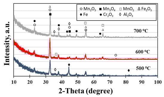 - The oxide layer contains manganese oxides (main phases), iron oxide, aluminum oxide, and chromium oxide at 600 and 700 °C, along with a few iron phase observed at 500 °C.