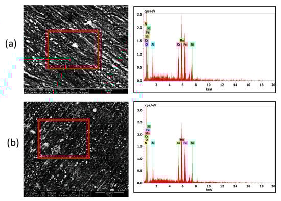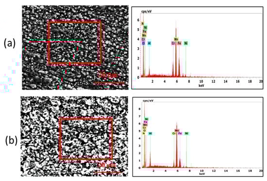 In the present study, Fe35Mn23Ni20Cr12Al12 HEA has about 60% of the activation energy for oxidation at 500–700 °C range compared to the same HEA system with lower Al content oxidized at 900–1100 °C (Fe35Mn28Ni20Cr12Al5) []. In the present oxidation case, the high thermal stresses that resulted from sample cooling and thermal shock may be the cause of the low spallation resistance []. In addition to this, the common oxide/metal interface cracking is caused by a mismatch in the thermal expansion coefficients of the oxide scale and bulk material that still occurs. Also, the present alloy is in the cold rolled condition which means high internal stresses and high dislocation density are present that reduce the oxidation resistance and produce non-protective oxide layers (i.e., the oxide layers do not contain/maintain protective layers). This may be the main reason the investigated HEAs follow the linear not parabolic oxidation rate. The Mn content is about twice the Al content in this HEA, thus, the Mn oxides are noticed after the Fe oxides. The linear oxidation rate of the HEA means the oxide layers are non-protective and may be cracked or loose from the outer surfaces. Due to the Pilling-Bedworth Ratio (PB Ratio), the non-protective layers have a PB ratio less than unity. This may be due to the difference in the oxide layers formed on the investigated HEA as given in Figure 4. The XRD patterns and EDX analysis indicated the existence of Al, Cr, Fe, and Mn oxides in almost all conditions.