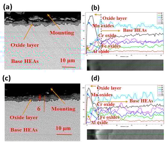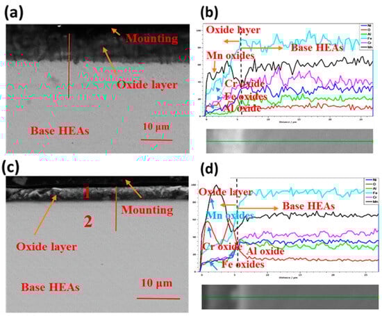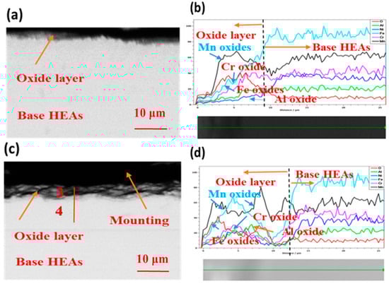 SEM images of the cross-section (CS) of the oxidized HEA at 500 °C for (a) 20 h and (c) 50 h and the corresponding Line–EDX analysis (b) and (d), respectively.