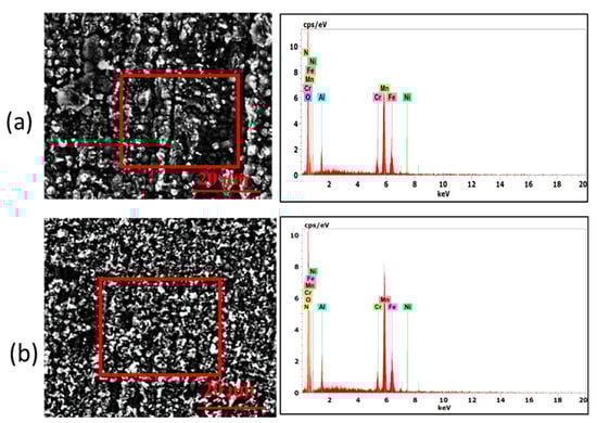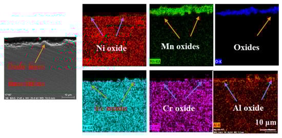 The SEM images of the oxide scales after 50 h at 500, 600, and 700 °C indicate the homogeneity of the layers formed with spallation in some parts of the oxide layer and the formation of the duplex layer at 600 °C. Normally, the formation of protective layers may be explained by the parabolic oxidation behavior of the alloy [], which is not the case for the present alloy at the investigated temperature range. The oxide layer thickness increases with the increase in the oxidation temperatures from 500 °C to 600 °C. By increasing the temperature to 700 °C the cracks appear and part of the oxide layer falls down and the thickness decreases as confirmed in Figure 12. This is the reason for the linear oxidation rate behavior of the HEA. Due to the HEA composition complexity, the oxidation mechanism at this temperature is inwardly controlled by oxygen. Generally, the formation of Al2O3 and Cr2O3 protective layers decreases the inward diffusion of oxygen through the air/scale interface []. Mn outward diffusion is higher than Cr by ~2 orders of magnitude and their oxides have high vacancies which permit the oxygen to diffuse inwardly []. The high manganese content in the oxide layer proposes that the oxidation mechanism is done by the outward diffusion mechanism. Almost all the formed oxide layers formed at different conditions contain Mn (mainly), Al, and a smaller content of Cr, Fe, and Ni oxides. Spinel structures may be formed in the oxide layers such as MnCr2O4 and MnFe2O4 formation, however, it is not identified by XRD due to the small amount that may be formed.