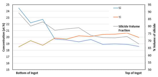 Concentration of Si and Ti and vol.% of βNb5Si3 between the bottom and top of the button/ingot of NT 1.2-AC. Thickness (bottom to top) of button/ingot about 5 cm.