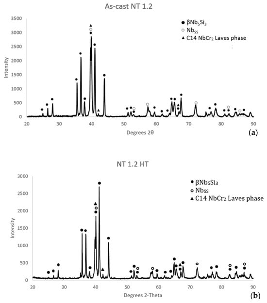 X ray diffractograms of (a) as cast and (b) heat treated (1500 °C/200 h) NT1.2.