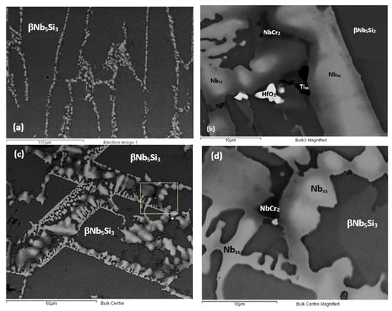 Back scatter electron (BSE) images of NT 1.2-AC showing (a) microstructure in the bottom of the button/ingot consisting of βNb5Si3 and eutectic, (b) microstructure of eutectic with Tiss (very dark contrast), (c) microstructure in the bulk with βNb5Si3 and eutectic, and (d) magnified image of selected area in (c). The light phase is A2 solid solution (Nbss), the grey phase is βNb5Si3 silicide, and the dark contrast phase is the C14-NbCr2 Laves phase. Note strong solute partitioning in A2 and the silicide, exhibited by the darker areas in the solid solution in (b,d), and by the darker areas in the silicide in (d). For microstructure where no eutectic was formed, see Section 3.2.