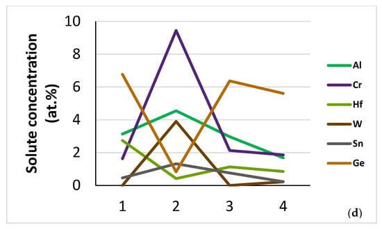 The partitioning of Ti was critical in NT 1.2-AC. Indeed, the Ti “pulled with it” Ge, Si and Sn and “pushed out” Cr in the C14-Laves phase (Figure 9a–d), meaning as the Ti concentration increased in the Laves phase so did the concentrations of Ge, Si and Sn, whereas the concentration of Cr decreased. Also, the Ti “pulled with it” Al and Cr and “pushed out” Mo and W in the A2 solid solution (Figure 10a–d) and “pulled in” Al and Cr in the βNb5Si3 (Figure 11a,b) and Hf. Furthermore, the Ti “pushed out” <Cr> = Al + Cr + Ge + Si + Sn in the C14-Laves phase (Figure 9e) [], and “pulled with it” <Si> = Al + Ge + Si + Sn in the A2 solid solution (Figure 10e). Also, in the A2 solid solution, the Al “pulled with it” Ge and Sn (Figure 10f), in agreement with []. In other words, Ti “worked” in synergy and intricateness (see Appendix A in []) with the other solutes and vice versa, and the aforementioned CC and “conventional” phases were entangled. The significance of synergy and entanglement for the design and development of metallic UHTMs was recently discussed by one of the authors in [].