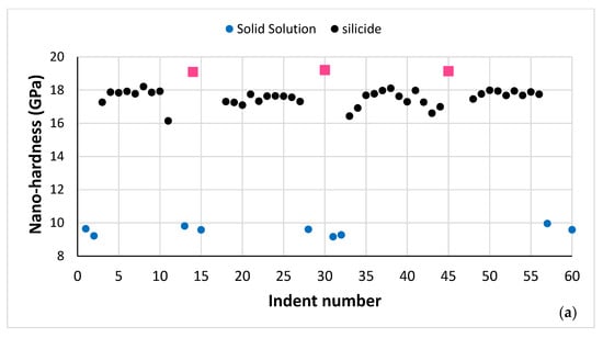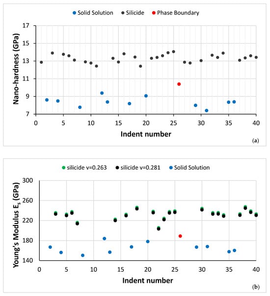 (a) Nano-hardness and (b) Young’s modulus data for the microstructure shown in Figure 7. Red data points correspond to silicide that was very rich in Ti.
