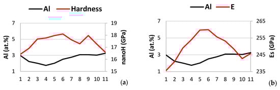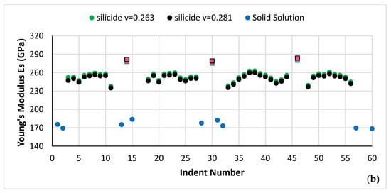 The values of Ei and νi were specified in the TriboScope manual [] as 1140 GPa and 0.07, respectively. The Es was calculated for three different values of νs, namely 0.38 for the A2 solid solution, and 0.263 and 0.281 for the silicide, see [,].