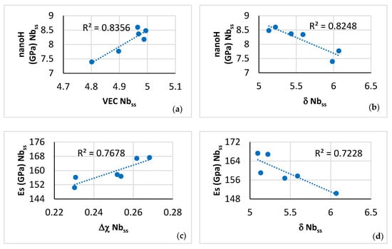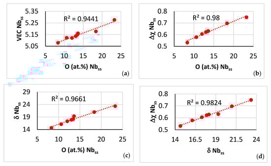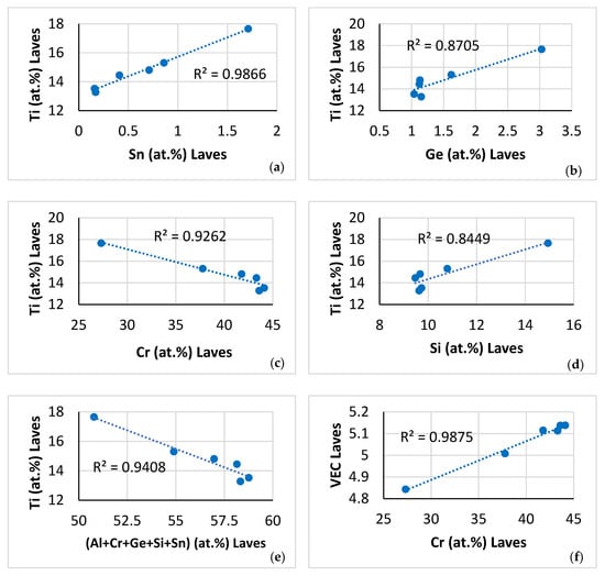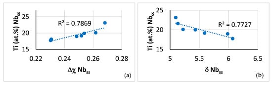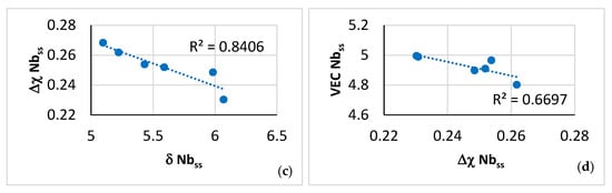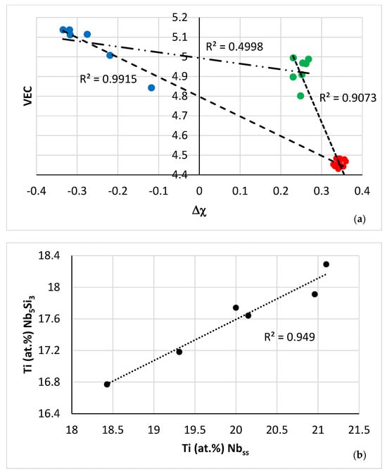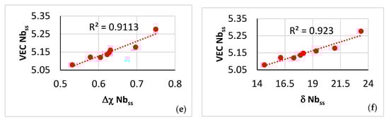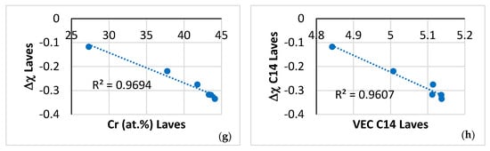 The relationships between solutes and the parameters VEC and Δχ for the C14-Laves phase, or the parameter VEC of the βNb5Si3, or the parameters δ and Δχ of the A2 solid solution, that are shown, respectively, in Figure 9f and g, Figure 11c and d and Figure 12a and b, are in agreement with [,,,].