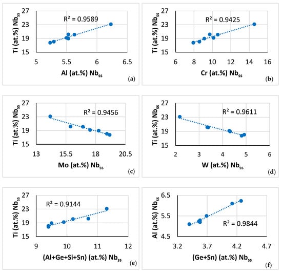 Relationships between solutes in the A2 solid solution in NT 1.2-AC. (a) Ti versus Al, (b) Ti versus Cr, (c) Ti versus Mo, (d) Ti versus W, (e) Ti versus Al + Ge + Si + Sn, and (f) Al versus Ge + Sn.