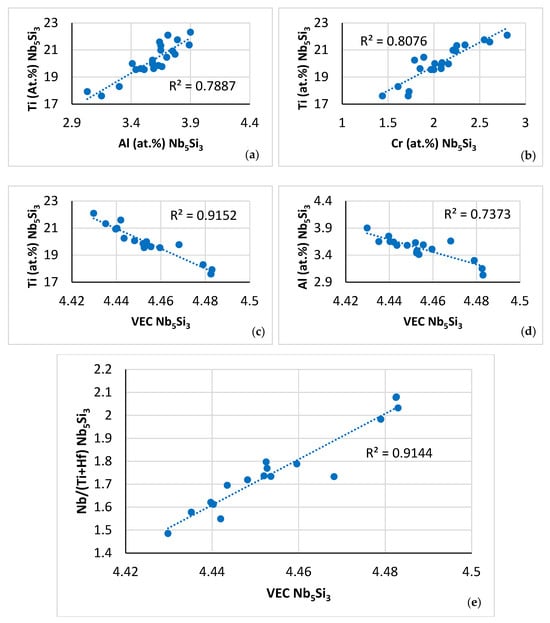 Data for the βNb5Si3 in NT 1.2-AC. Relationships between solutes and between solutes and the parameter VEC. (a) Ti versus Al, (b) Ti versus Cr, (c) Ti versus VEC, (d) Al versus VEC, and (e) relationship between the Nb/(Ti + Hf) ratio and the parameter VEC.