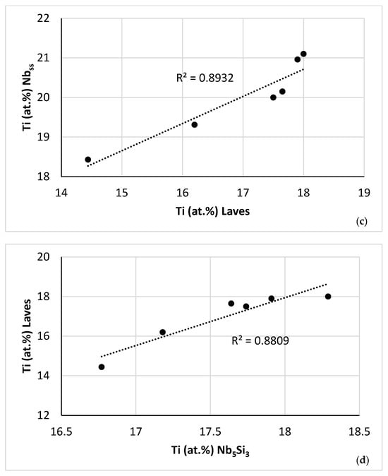 (a) Map of the parameters VEC and Δχ for the A2 solid solution (green data), C14-Laves phase (blue data) and D8m βNb5Si3 silicide (red data) in NT 1.2-AC. R2 = 0.9915 for correlation between C14-NbCr2 Laves phase and βNb5Si3, R2 = 0.9073 for the correlation between βNb5Si3 and A2 solid solution, and R2 = 0.4998 for the correlation between A2 solid solution and C14-NbCr2 Laves phase. (b–d) Relationships between Ti concentrations in the A2 solid solution, C14-Laves phase and D8m βNb5Si3 silicide. (b) Ti in Nb5Si3 versus Ti in Nbss, (c) Ti in Nbss versus Ti in Laves, (d) Ti in Laves versus Ti in Nb5Si3.