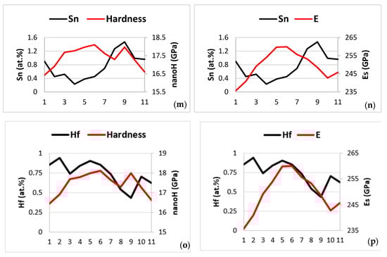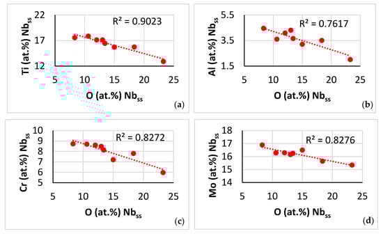 The value of each of the parameters VEC, Δχ and δ of the contaminated with oxygen A2 solid solution increased as the contamination became more severe (Figure 15a–c), in agreement with [] (see Figure 11). Furthermore, the trends between the aforementioned parameters that are shown in Figure 15d–f were in agreement with [] (see Figure 10a–c). In other words, the data in Figure 15 complements the data in []. To the authors’ knowledge, this is the first time that comprehensive data has been published for the solutes and parameters of a contaminated with oxygen A2 solid solution in a RCCA with simultaneous addition of transition and refractory metals (Cr, Hf, Mo, Nb, Ti, W) and simple metals and metalloid element (Al, Ge, Si, Sn) that are known to benefit both mechanical properties and oxidation resistance in the same metallic UHTM [].