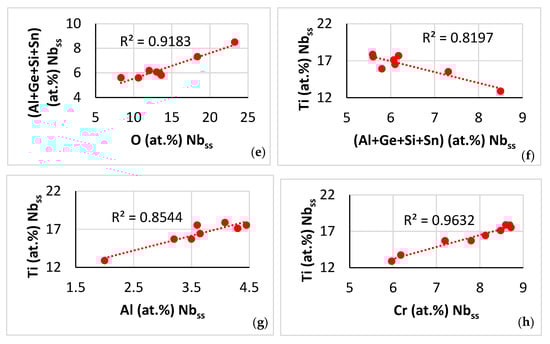 Contaminated microstructure: In this section, the contamination of the A2 solid solution and the βNb5Si3 silicide is discussed with the help of Figure 14, Figure 15, and Figure 16 and Figure 17, respectively. Note that in this work the oxygen content of phases was analysed using EDS with standards (see Section 2), not using EPMA, thus Figure 14, Figure 15, Figure 16 and Figure 17 show trends in relationships between solutes, between solutes and oxygen content and between parameters and oxygen content and the R2 values shown in the said figures are for these trends. The concentration of different solutes in the A2 solid solution “controlled” the severity of its contamination with oxygen, which was low when the Al, Cr, Mo and Ti concentrations were high (Figure 14a–d). The contamination with oxygen of the A2 solid solution increased with its <Si> = Al + Ge + Si + Sn content (Figure 14e), which was consistent with the trends in the Ti versus the <Si> = Al + Ge + Si + Sn content data (Figure 14f) and the Ti versus O (Figure 14a) data. Note that the trend shown in Figure 14f is different from that in the solid solution in NT 1.2-AC (Figure 10e), whereas the trends between Ti and Al (Figure 14g) and Ti and Cr (Figure 14h) are the same as those in the NT 1.2-AC shown in Figure 10a,b. The aforementioned difference is attributed to the trend between Al and Ge + Sn content of the A2 solid solution in the near surface contaminated areas and in the bulk of NT 1.2-HT (see below). To the authors’ knowledge, this is the first time that trends showing how the contamination of the A2 solid solution in a RCCA depends on different solutes in the A2 solid solution, i.e., Figure 14a–e, have been reported in the literature. Also, this is the first time that trends between solutes in contaminated with oxygen A2 solid solution in a RCCA, i.e., Figure 14f–h, have been presented.