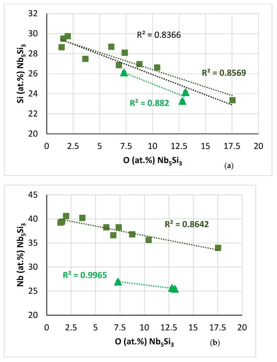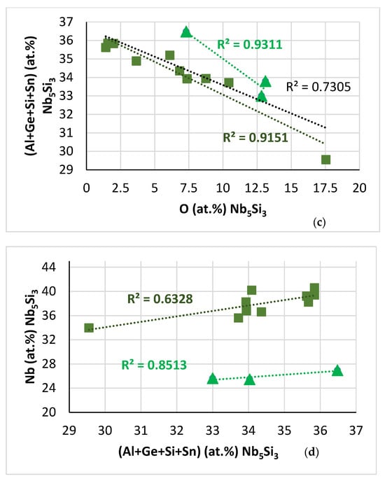Data for the contaminated with oxygen Nb5Si3 in the near surface areas of NT 1.2-HT200. Squares for “normal” Nb5Si3, triangles for Nb5Si3 very rich in Ti. (a–c) Trends in relationships between solutes and oxygen. (a) Si versus O, R2 = 0.8366 for all data, R2 = 0.8569 for “normal” Nb5Si3, R2 = 0.882 for silicide rich in Ti, (b) Nb versus O, R2 = 0.8642 for “normal” Nb5Si3, R2 = 0.9965 for silicide rich in Ti. (d) Nb versus Al + Ge + Si + Sn in Nb5Si3.