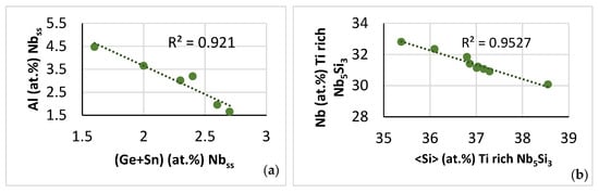 Relationships between solutes in the C14-NbCr2 Laves phase, such as those shown in Figure 9a–e, have not been reported before. Also, the relationships between the Ti, Al and Cr contents of the βNb5Si3 (Figure 11a,b) complement the data for the silicide in [] (Figure 21), [] (Figure 8), [] (Figure 13a,e), and together with the aforementioned data confirm the synergy of solutes in M5Si3 silicides (see []).
