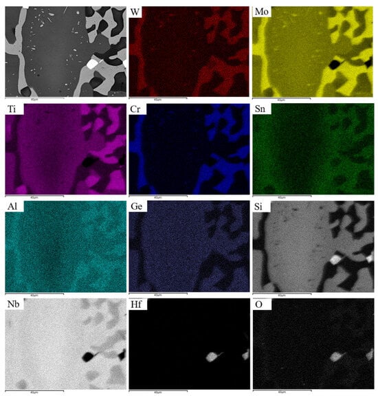 The partitioning of solutes in the A2 solid solution and the silicide that was discussed in this section was in agreement with previous research for the solid solution [,,,] and the silicide []. In the solid solution, the <Si> = Al + Ge + Si + Sn content increased from 7.6 at.% in the “normal” solid solution to 14.4 at.% in the Ti rich solid solution (changes that are expected to have an effect both on the toughness and the oxidation resistance of the A2 phase []), whereas the Mo + W content decreased from 22.2 to 8.8 at.% (changes that are expected to affect the yield strength, toughness, oxidation resistance and contamination (see below section “contaminated microstructure”) of the A2 phase [,]). In the silicide, the <Si> = Al + Ge + Si + Sn content increased from 36.4 at.% in the “normal” silicide to 38.9 at.% in the Ti rich Nb5Si3, i.e., the solubility range of <Si> shifted to higher values, in agreement with [], and the Nb/(Ti + Hf) ratio was larger than one (2.1 and 1.37, respectively), which is indicative of tetragonal Nb5Si3 [], in agreement with the XRD data (Figure 2a). In the C14-NbCr2 Laves phase the <Cr> = Al + Cr + Ge + Si + Sn content was 57.5 at.%, in agreement with []. In the eutectic, the Mo and <Si> = Al + Ge + Si + Sn contents were in agreement with [].