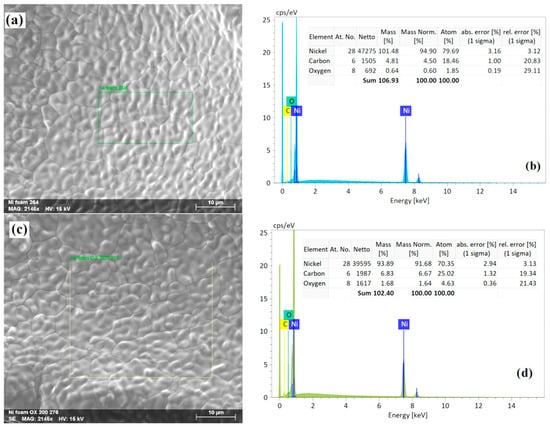 (a) SEM micrograph picture for original Ni foam surface, 2145× magnification and acceleration voltage of 15 kV; (b) as above, but EDX spectrum and surface elemental composition; (c) as in case (a) but surface of Ni foam was electro-oxidized; (d) as in case (b) above, but Ni foam surface was electro-oxidized. Reprinted from Ref. [].