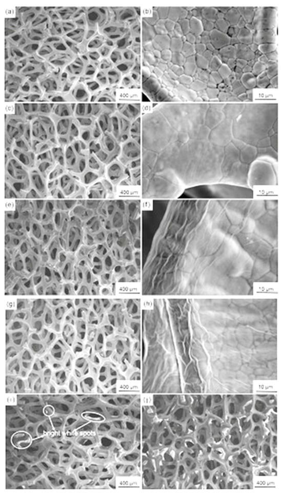 SEM images of (a,b) initial nickel foam and nickel foam covered with GO deposited at different voltages: (c,d) 20 V; (e,f) 40 V; (g,h) 60 V; (i) 80 V; and (j) 100 V. Reprinted from Ref. [].