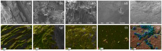 SEM and EDX images of porous host materials before and after CaCl2 impregnation: (a–e) represent untreated V, EP, Pm, SG, and Z, respectively; (f–j) show the corresponding impregnated composites with visible CaCl2 distribution. Reprinted from Ref. [].