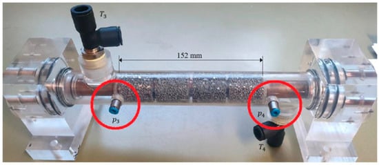 Metal foams play a crucial role in thermal management and heat transfer due to their porous structure and unique properties. Their high specific surface area, combined with good thermal conductivity, makes them ideal materials for optimizing heat transfer in various applications, such as heat exchangers, heat sinks, and thermal storage systems. Thin-walled copper tubes and A356 metallic syntactic foam were successfully combined by Fiedler and Movahedi to form small heat transfer components that can be used within shell-tube recuperators (Figure 5) []. Maximum heat transfer was increased to 1.8 kW in comparison to a single exposed copper tube (maximum 0.5 kW). Furthermore, the heat transfer performance significantly outperformed the findings of an earlier investigation that used ZA27 foam elements (maximum 0.81 kW). The use of metallic foam both inside and outside the copper tube, which reduces convective heat transfer resistance, is the cause of this enhanced performance. At the bottom volumetric flow rate of 1.0 L/min, pressure drop measurements showed moderate losses of 1.19 kPa. However, at greater flow rates—that is, 7.36 kPa at 3.0 L/min—the pressure drop accelerated quickly. At the same time, comparatively little heat transmission was gained when the volumetric flow rate was increased. All things considered, it has been demonstrated that incorporating A356 foam to improve heat transmission is appropriate for creating small heat exchangers with high heat transfer rates.