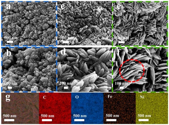 Morphological characterization: SEM images of NiFe-MOF-4 (a,b); NiFe-MOF-8 (c,d); NiFe-MOF-12 (e,f) at various multiples; (g) elemental mapping pictures of NiFe-MOF-8 (e,f). Reprinted from Ref. [].
