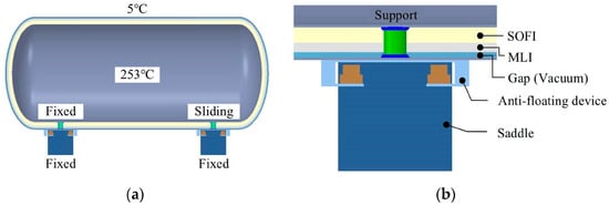 The most effective way to store hydrogen is in a liquid state. A 0.7 m3 liquid hydrogen fuel tank, appropriate for small containers, was proposed in the study of Gancarczyk et al., and its integrity was evaluated by a structural analysis []. Vacuum insulation is crucial to reducing convectional heat transfer because of the exceptionally low liquefaction temperature of hydrogen (−253 °C) and the requirement for spatial efficiency in liquid hydrogen fuel tanks. In the vacuum annular space between the inner and outer shells, a composite insulation system consisting of MultiLayer Insulation (MLI) and Sprayed-On Foam Insulation (SOFI) was adopted (Figure 7) []. A tube-shaped supporter composed of a G-11 cryogenic (CR) material with high strength and low thermal conductivity was also used. Because STS 316L has minimal sensitivity to hydrogen embrittlement and appropriate ductility and strength at cryogenic temperatures, it was chosen for the inner and outer layers of the tank. The Boil-Off Rate (BOR) of the fuel tank’s design was employed to objectively evaluate the insulating performance. Using heat transfer and structural assessments in compliance with the IGF code, structural integrity assessments were carried out for nine load scenarios.
