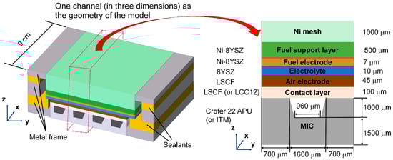 Various chemical energy carriers can be effectively converted to electricity and vice versa by solid oxide cells. The quicker degradation rate in comparison to other fuel cell/electrolyzer technologies is now the most pressing issue. It is useful to simulate a solid oxide cell in order to comprehend the degradation mechanisms []. Due to licensing concerns, a knowledge transfer gap between academia and industry is progressively developing because the majority of earlier research created models using commercial tools, such as COMSOL and ANSYS Fluent. The multiphysics model presented in the work of Yu et al. was created using the openFuelCell2 (OpenCFD Limited, Bracknell, UK) computational code. OpenFOAM, an open-source library, is used to implement the code. It accounts for momentum transfer, mass transfer, electrochemical reactions, and metal interconnect oxidation. The model can precisely predict I–V curves under different temperatures, fuel humidity, and operation modes. Comparison between OpenFOAM and COMSOL simulations shows good agreement. The metal interconnect oxidation is modeled, which can predict the thickness of the oxide scale under different protective coatings. Simulations are conducted by assuming an ultra-thin film resistance on the rib surface. It was found that coatings fabricated by atmospheric plasma spraying can efficiently prevent metal interconnect oxidation, with a contribution of only 0.53% to the total degradation rate (Figure 8).