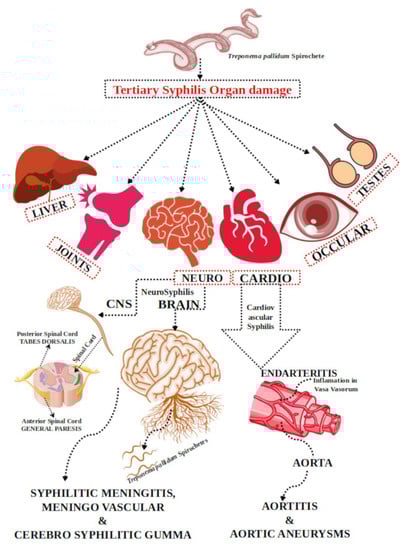 Following infection, syphilis can present as a chancre (primary syphilis/first site of infection) 10–90 days (average three weeks) after manifestation. If syphilis is not adequately treated, the chancre may disappear. Nevertheless, within a few weeks or months, the symptoms of secondary syphilis may appear and can be seen on the host body. The symptoms may vary and comprise rashes on the body, alopecia (loss of hair), condylomata lata, and vague symptoms with malaise, sore throat, weight loss, and low-grade fever. Secondary syphilis manifestation can also vanish within a few weeks, even without treatment; then, “latent syphilis” follows, where the patients do not display any symptoms and indications but remain infectious for up to a year following infection [4,9]. Latent infection can last for decades if untreated and leads to tertiary syphilis complications [10]. Tertiary syphilis can evolve with manifestations that depend on which organ is involved [11,12,13].