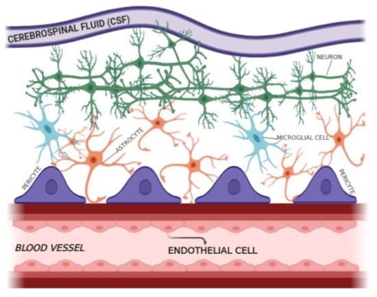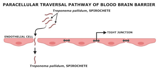 The neurological disorder’s expression by neuro-invading pathogens is usually connected via infiltration of the blood–brain barrier (BBB) and CNS invasion [52]. The BBB is a structural and functional barrier built by the brain’s microvascular endothelial cells (BMECs), astrocytes, and pericytes (Figure 2) and is one of the compact barriers inside the human body that defends the brain from various infirmities caused by pathogens. Importantly, it maintains the neural microenvironment by controlling molecular travel into and out of the CNS and permitting blood vessels to regulate ions and other molecules strongly. It protects the CNS against blood-borne microorganisms and toxins [53,54,55]. BMECs are essential for imparting nutrients to the brain with tight junctions and using the efflux pump mechanism for unrecognized particles to carry blood circulation [56]. Astrocytes and pericytes assist in properly handling BMECs [53,55]. However, their role in the microbial traversal of the barrier is still not adequately explained. In addition, astrocytes (interaction of endothelial cells via astrocyte end-feet, Figure 2) [57] and microglial cells [55,58] govern hematogenous cell recruitment and provide strength in the translocation of specific pathogens [53]. Diverse microorganisms have the potential to traverse the BBB, infect the CNS, and travel through the BBB Transcellularly (no evidence of Trojan horse disruption), Paracellularly (between the cells), and by infection of phagocytes via the Trojan horse mechanism (within infected phagocytes) [52,59]. Tp is an obligate human pathogen that can rapidly invade the circulatory system and traverse the blood–placenta, blood–retina, and blood–brain barriers [60].