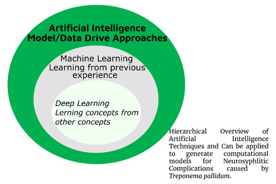 One of the most complex organs in humans is the brain, and the unusual brain behavior in psychiatric or mental illness is still comprehensively unknown. Despite having intended advancements in diagnostics and therapy in several medical areas in the last few decades, our insights into mental deformation are limited and outdated [141]. The bacterium Tp subsp. pallidum, responsible for syphilis, can cause several complications in the CNS and can be recognized in CSF in the early phase of the complication. Neurosyphilis can arise at any time from the first infection, as explained above, with several life-threatening severe psychiatric consequences in diverse brain parts later, for example, in early NS complications—meninges, cerebrospinal fluid, cranial nerves, and vasculature—and late NS complications—the brain with spinal cord parenchyma has been reported [17,147]. One of the milestone studies by Lukehart et al. [37] illustrated that approximately 12 out of 40 patients had neuroinvasion proof in the early phase of the disease compared with the late phase [17,37]. However, CSF examination is still the central component [148]. CN and NI are cutting-edge neuroscience research fields to integrate computer science, physics, and applied mathematics. In this review article, we explain multiple new CN techniques, as explained above. NI techniques (which are already in use for several mental illnesses) can be applied to various NS complications to better understand them. These techniques may also help researchers generate new theories, create computational and simulation environments for modeling, and better understand NS complications. They may also help develop tools for data acquisition, exploration, visualization, and distribution of NS.