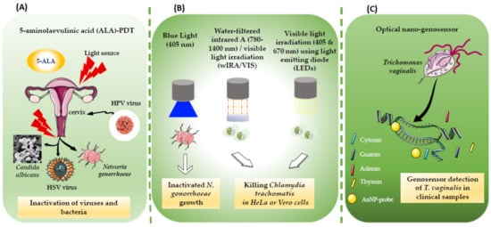 (A) Treatment of multifocal disease based on 5-aminolaevulinic acid (ALA)-PDT, effective in treating HPV lesions. The PDT can be also used for selective and specific destruction of subclinical bacteria and fungui-infected areas, as in the case of N. gonorrhoeae and C. albicans. (B) The combination of water-filtered infrared A (wIRA) with visible light VIS (wIRA/VIS) is used for killing intracellular and extracellular Chlamydia trachomatis strains in Vero and HeLa cell lines. Visible light irradiation (405 and 670 nm) also leeds to dose-dependent inhibitory effect on Chlamydia. (C) Diagnostic approach based on an optical nano-genosensor and gold nanoparticles conjugated to a specific oligonucleotide for T. vaginalis PCR detection.