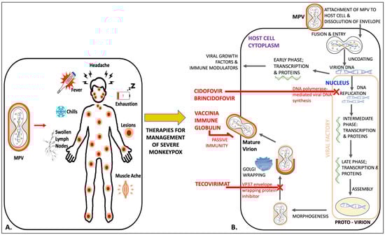 An illustration of the symptoms of monkeypox (A) and the life cycle of MPV inside the host-cell cytoplasm to elicit the mechanism of action of four different antiviral therapies: cidofovir, brincidofovir, vaccinia immune globulin, and tecovirimat (B).