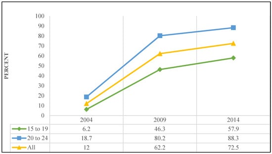From 2004 to 2014, the prevalence of HIV testing among AGYW in Lesotho increased by two-thirds. The rate of HIV testing increased by 50.2% over a 5-year period from 2004 and 2009, and by a mere 10.3% for the same period from 2009 to 2014 in our trend analysis. From 2009 to 2014, the rate of participants who had ever received an HIV test was very low compared to 2004 to 2009. It is likely that the overall increase in HIV testing was due to improved public awareness of HIV/AIDS and accessible HTC services. According to Peralta et al. [], additional features that may improve HIV testing among youth include free HIV tests, rapid HIV tests, and convenient or accessible HTC services. Age was partitioned in five years age groups (15–19 and 20–24 years), and we observed that over a period of 10 years from 2004 to 2014, the uptake HIV testing increased by 51.7% amongst the 15–19 years old and 69.6% for the 20–24 years old. Progress was perceived across all age groups, but the proportion of participants who had ever received an HIV test was greater among AGYW aged 20–24 years. Generally, older youths are more educated than younger youths, and education has a remarkable impact on people’s health because it empowers individuals to make healthier choices. Individuals with more years of education are likely to have better health and well-being, and tend to practice healthier behaviours []. The rationale behind lower rates of HIV testing among younger AGYW might thus be a lower level of education.