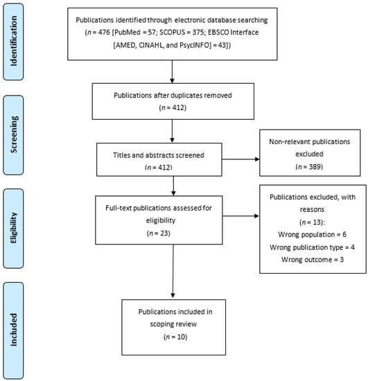 - Peters, M.D.; Godfrey, C.M.; Khalil, H.; McInerney, P.; Parker, D.; Soares, C.B. Guidance for conducting systematic scoping reviews. Int. J. Evid. -Based Healthc. 2015, 13, 141–146. [Google Scholar] [CrossRef] [PubMed]