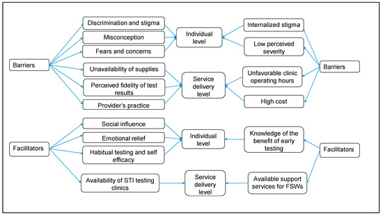 In our study, several facilitators contributed to the screening of HIV and other STIs among FSWs, including social influences, emotional relief, habitual testing, self-efficacy, and the availability of numerous testing clinics for STIs. Similarly, another Ugandan study revealed that motivations to stay healthy, marry, and have children, understanding treatment benefits, and partner influence were facilitators at an individual level, while sex-worker clinics and testing-facility availability were facilitators to testing for HIV and syphilis [23]. Conversely, our participants reported several barriers to STI screening, including unavailability of supplies and high costs, discrimination and stigma, unfavourable operating hours, fears and concerns regarding STI testing, and perceived fidelity of test results. Previous studies have shown similar barriers to STI screening among this population, with stigma and misconceptions being the most common [23,24]. Other barriers include cost concerns at an individual level, low perceived severity of syphilis infection and poor and unfriendly provider attitudes, facility shortages, and unfriendly environments within the health system; all of these were reported [23,24]. Moreover, peer education and reminders in the form of text messages have been shown to improve HIV and syphilis screening among FSWs by nearly 50% in three months [24]. Therefore, such interventions hold promise in enhancing the uptake of STI screening services in this population.